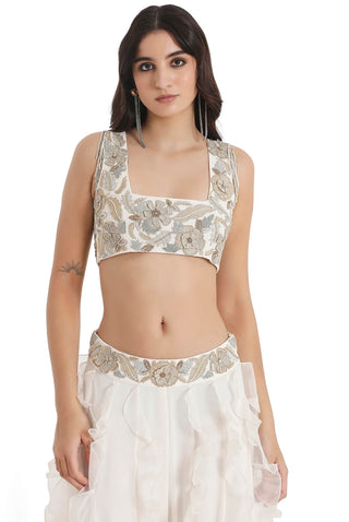 Ivory embroidered choli and ruffle lehenga with dupatta