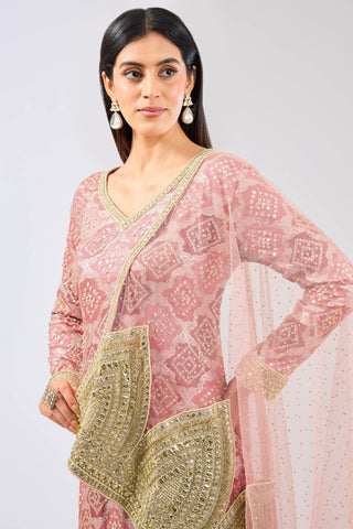 Peach embroidered asymmetric kurta paired with pants and dupatta