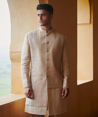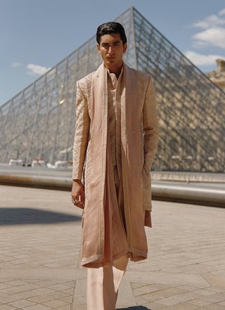 For a destination wedding, an Indian groom can opt for a lighter sherwani, kurta set, or bandhgala suit, choosing breathable fabrics like linen or cotton for comfort in warm, coastal environments.