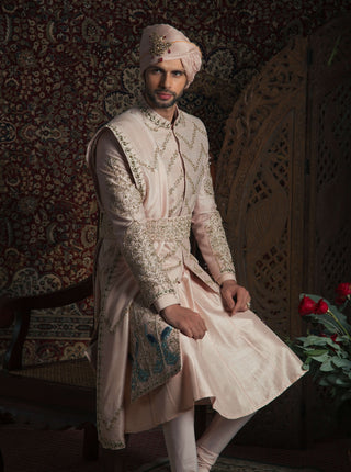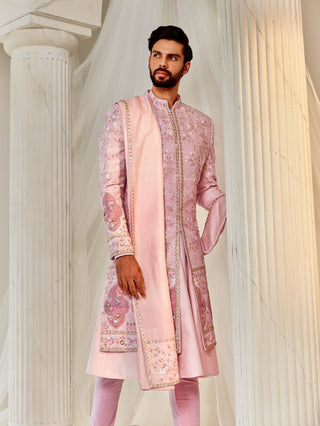 Pink thread work cut dana french knot embroidered bucket cut sherwani set