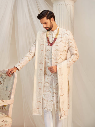 Ivory scalap bead and frenchknot embroidered bucket cut sherwani