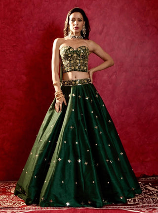 Emerald green tone-on-tone hand-embellished corset with skirt
