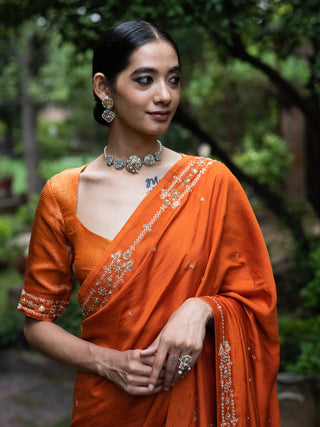 Rust orange embroidered silk saree and blouse