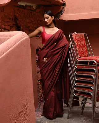 Mahogany hand embroidered saree with vermillion blouse