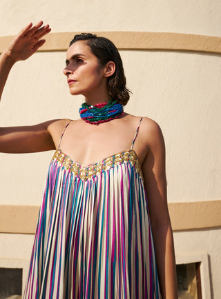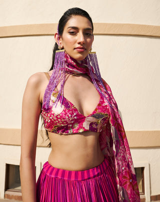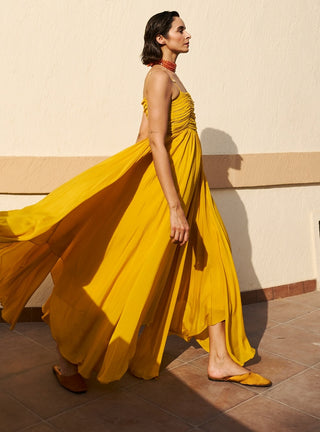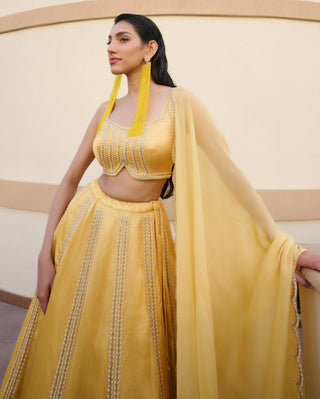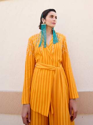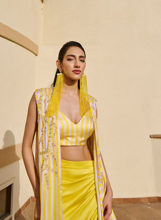 Citrus yellow-white long jacket, bralet and cowl skirt
