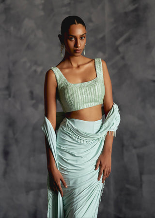 Aqua blue embroidered stitched saree set