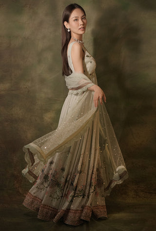 Off-white embroidered high-low anarkali with churidar and a dupatta