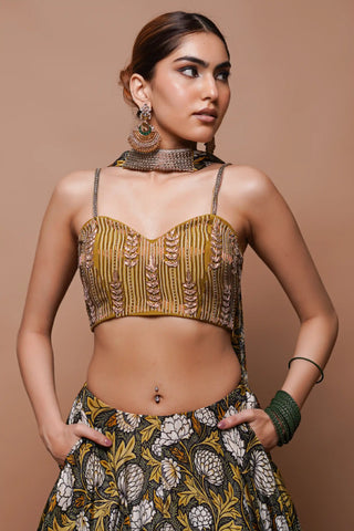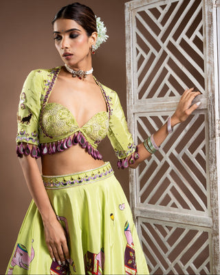 Green lime green double layer lehenga paired with blouse & dupatta