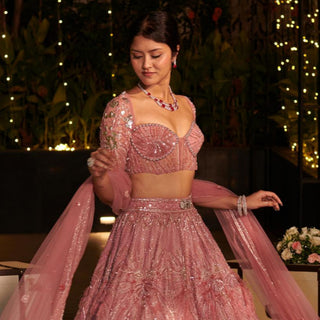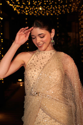 Beige embroidered hitch lehenga set with attached drape dupatta