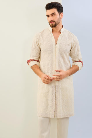 Offwhite georgette line fully embroidered kurta with bundi and matching cotton silk pant