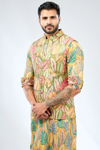 Peach thread embroidered kurta with bundi and cotton silk pant