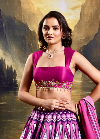 Pink satin printed lehenga with a hand-embroidered blouse & dupatta