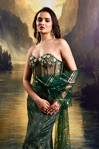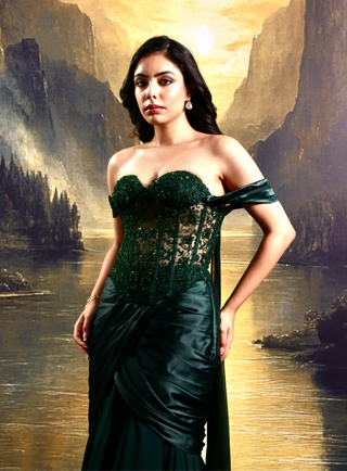 Emerald green tone-on-tone hand-embellished corset with skirt