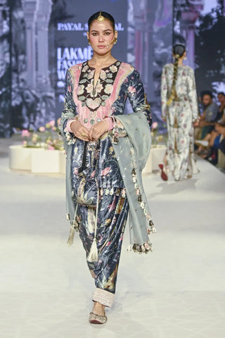 Black printed embroidered kurta and embroidered patiala salwar with dupatta