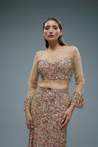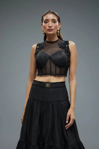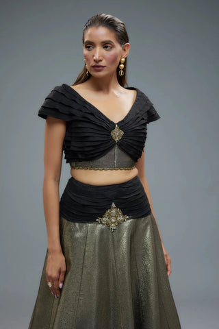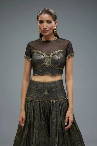 Black and gold sheer blouse with lehenga