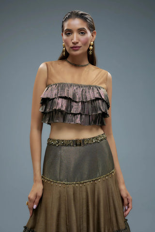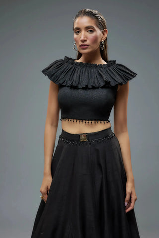 Black ruffle blouse with raw silk lehenga
