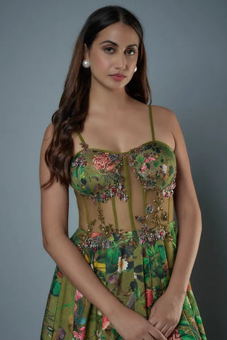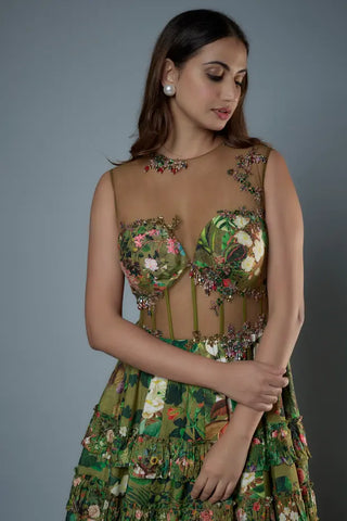 Green embroidered botanical printed raw silk gown