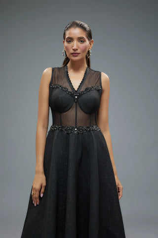 Black polylurex and net patchwork corset gown