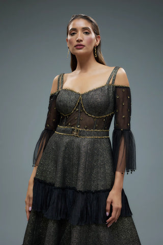 Black polylurex and net frilled gown