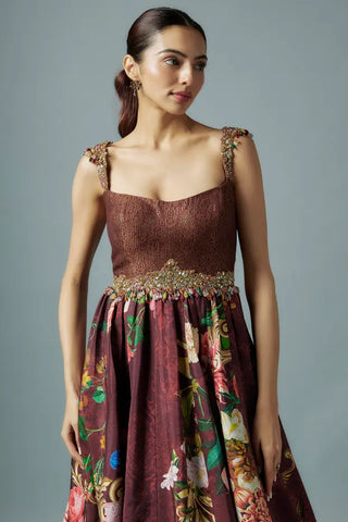 Multicolor botanical printed raw silk gown with brocade bodice