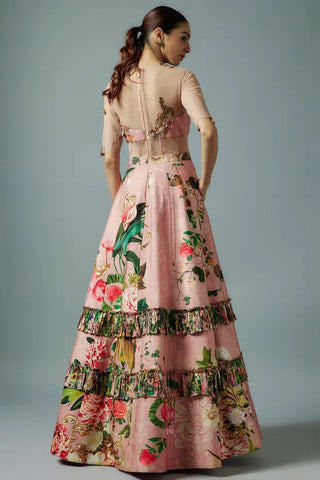 Pink raw silk and net botanical printed gown