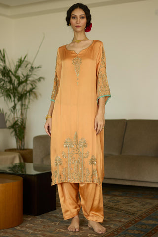 Orange palm hand embroidered kurta set