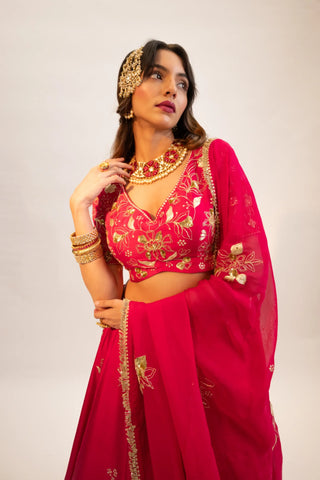 Pink embroidered lehenga, blouse paired with embroidered dupatta
