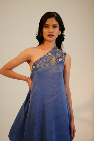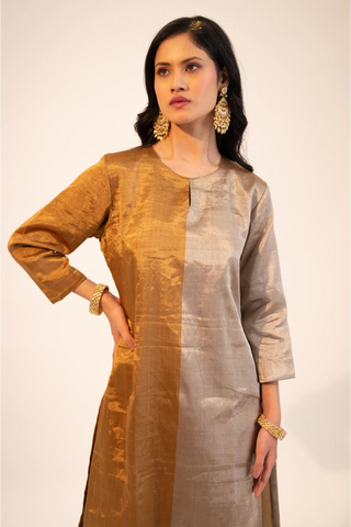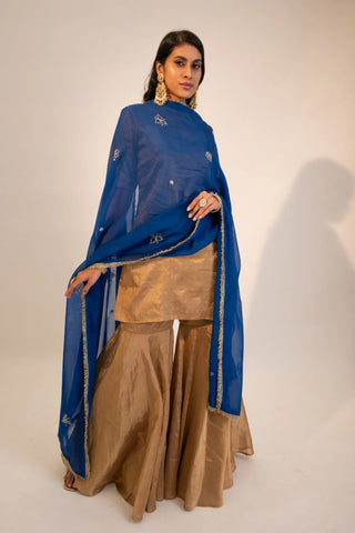 Beige zari tissue gold kurti & garara paired with electric blue dupatta