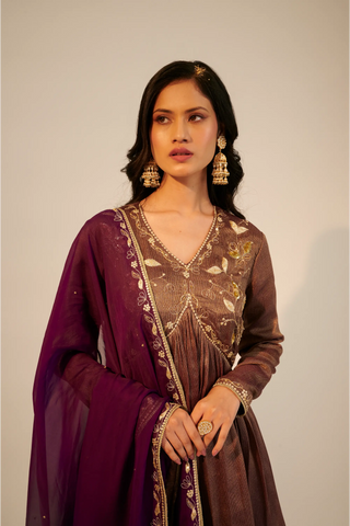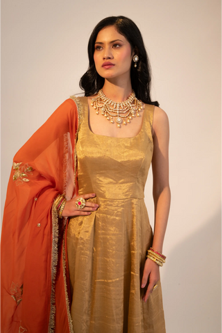 Beige zari tissue gold dual tone anarkali paired with rust dupatta