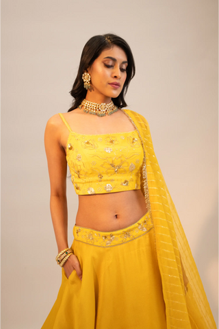 Beige zari tissue gold lehenga & blouse paired with yellow dupatta