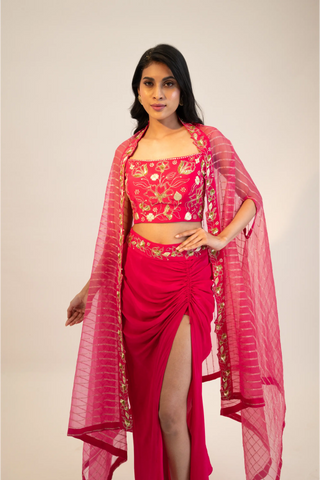 Pink embroidered blouse paired with slit skirt, belt and cape
