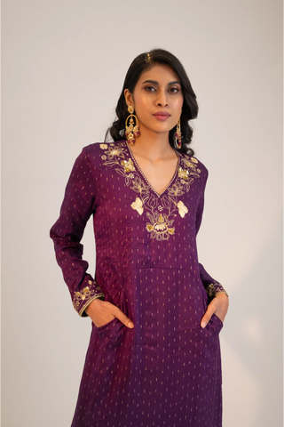 Purple embroidered short anarkali paired with garara pants and dupatta