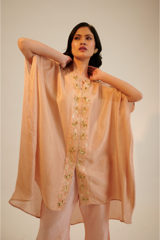 Peach embroidered asymmetric kurta paired with pants and dupatta