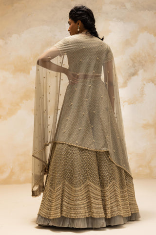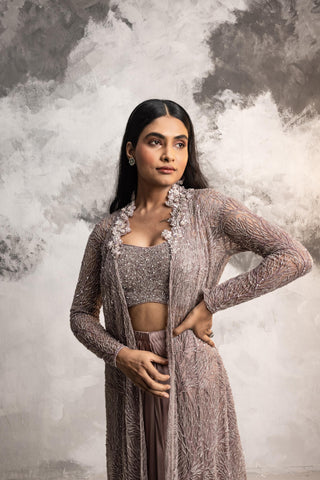 Dusty purple embroidered long kali jacket with bustier and drape dhoti skirt