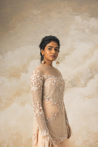 Peach embroidered short kurta paired with ruffle sharara and dupatta