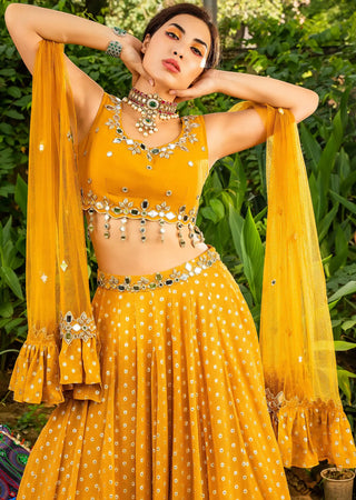 Yellow cape with attached blouse and mirror work pallazo