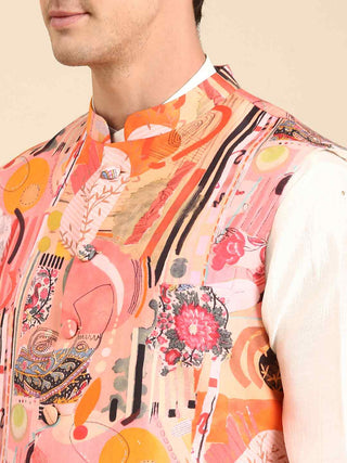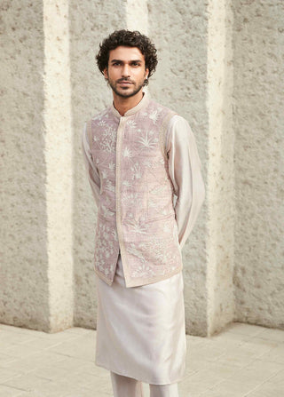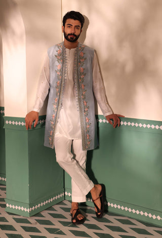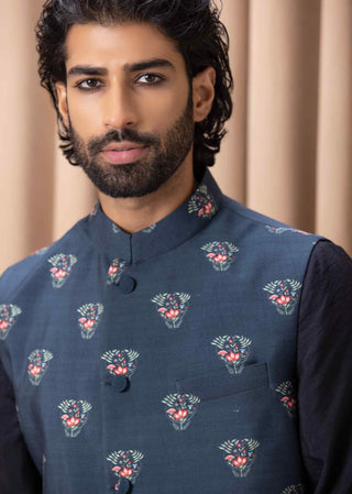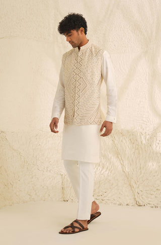 A Bandi jacket is a sleeveless, high-neck garment worn over a kurta. It provides a tailored, formal look and is typically worn for weddings, receptions, and other elegant occasions.