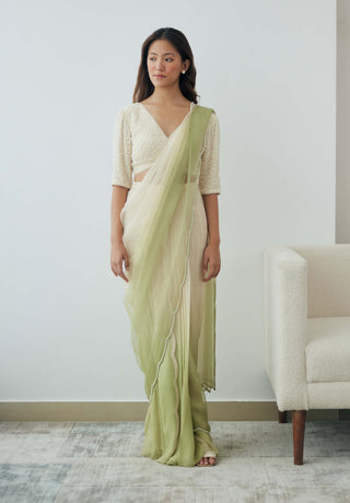 Ivory and green ombre pre-draped saree and blouse