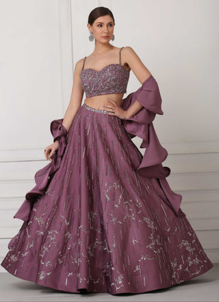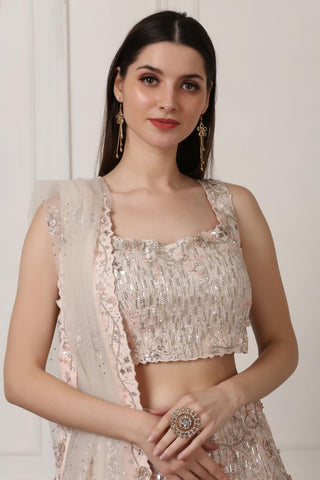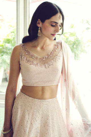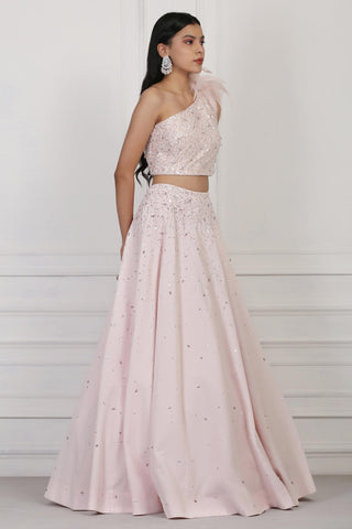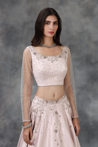 Light pink katdana and sequin embellished cape sleeve crop top skirt set