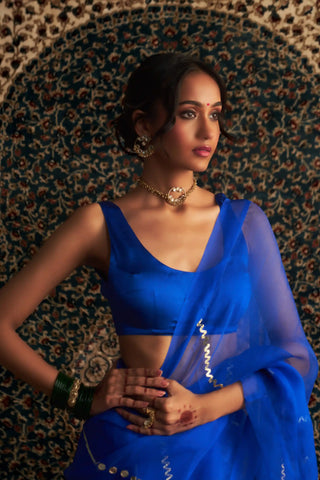 Popular options include silk, georgette, chiffon, and organza sarees — each offering a distinct drape and texture.