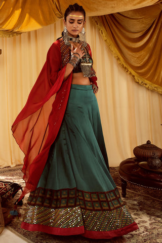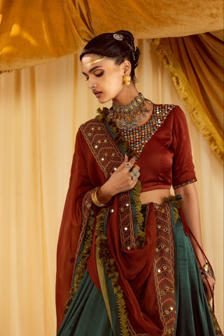 Teal lehenga with rust pararambh choli & hand embroidered dupatta