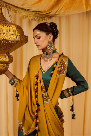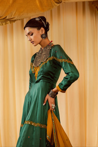 Mustard Anarkali suit pararambh with teal waist jacket & dupatta