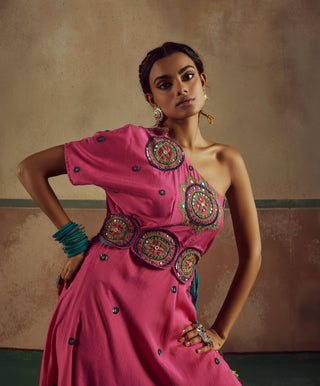 Pink anarkali set pararambh with contrast patchwork & mirror work