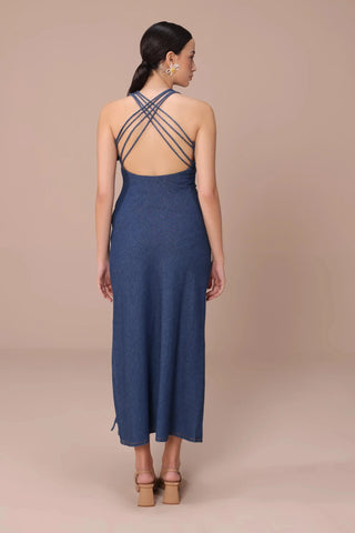 Blue denim high slit dress