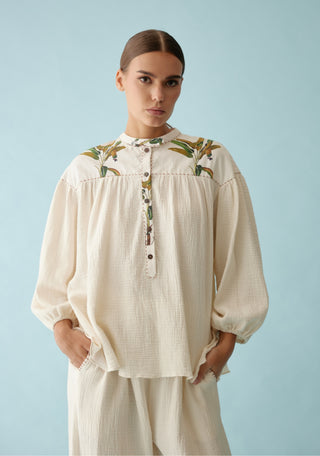 Blue solid crepe asymmetrical handwork kurta paired with printed sharara and dupatta