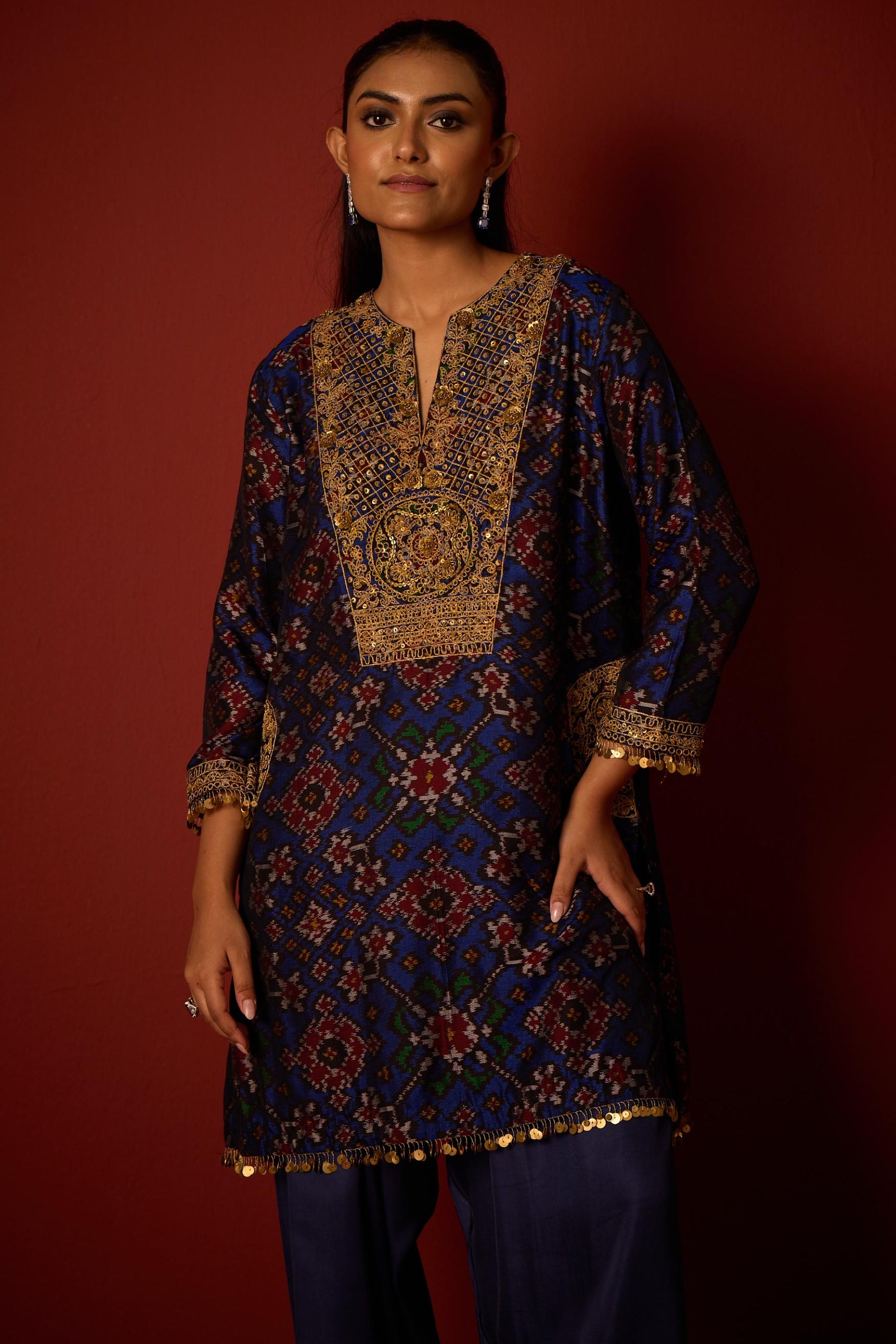 This Deep Indigo farshi salwar set blends patola design with traditional silhouette, ideal for classic ceremonies and graceful festive looks.