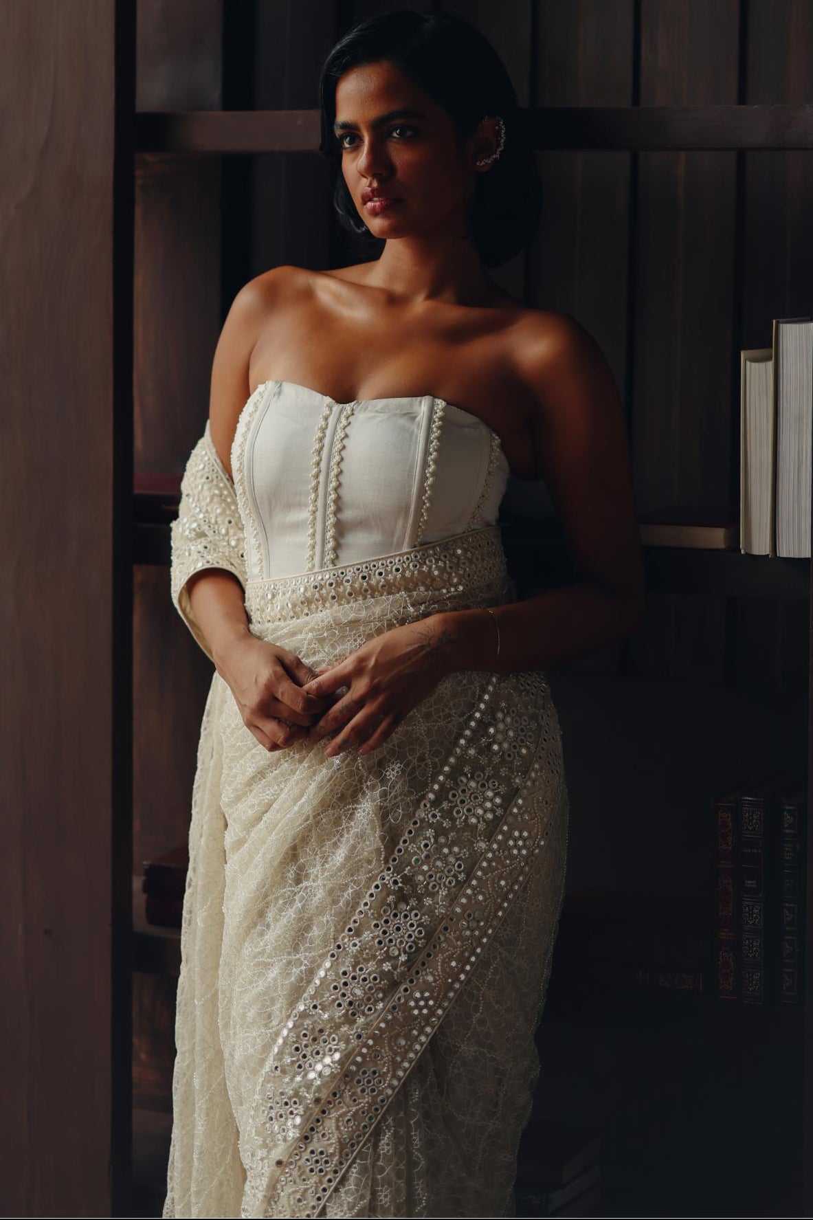This dewdrop ivory jaal saree is delicate, intricate, and perfect for daytime weddings, intimate functions, and elegant celebrations.