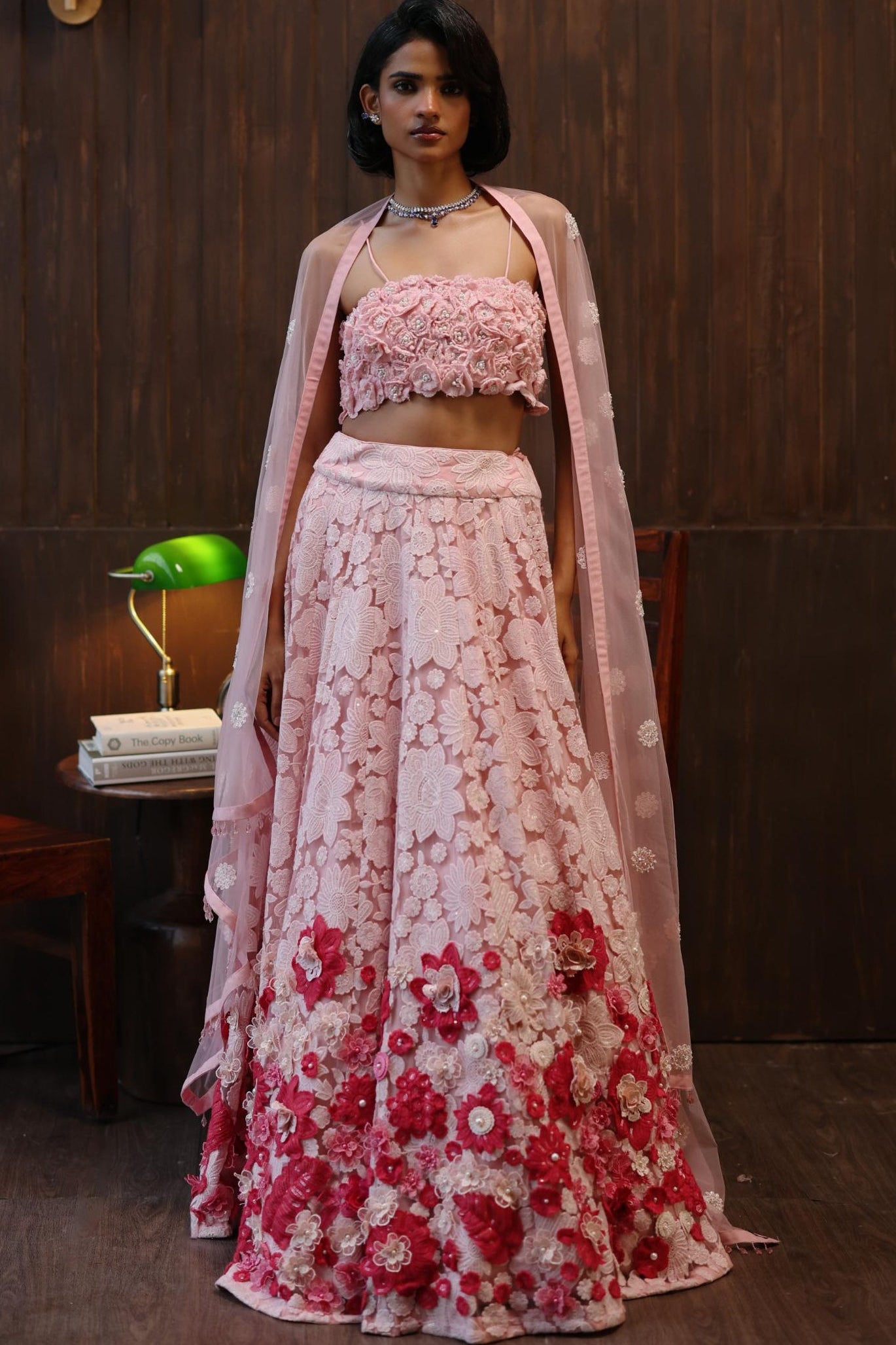 This Pink Garden Muse lehenga set blends romantic tones with soft festive movement. Perfect for sangeets, mehendi celebrations, or daytime weddings, it brings a beautifully feminine charm.