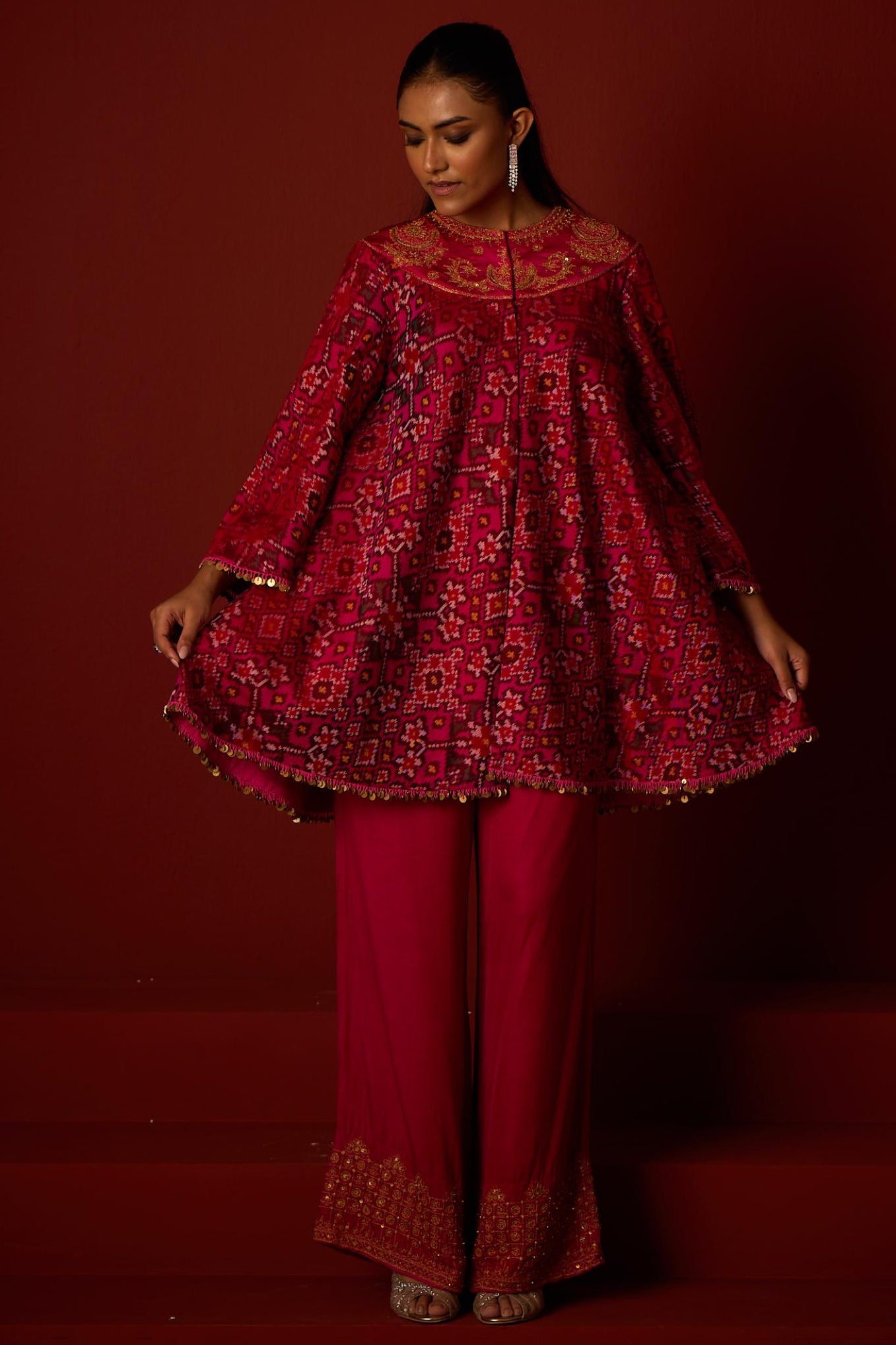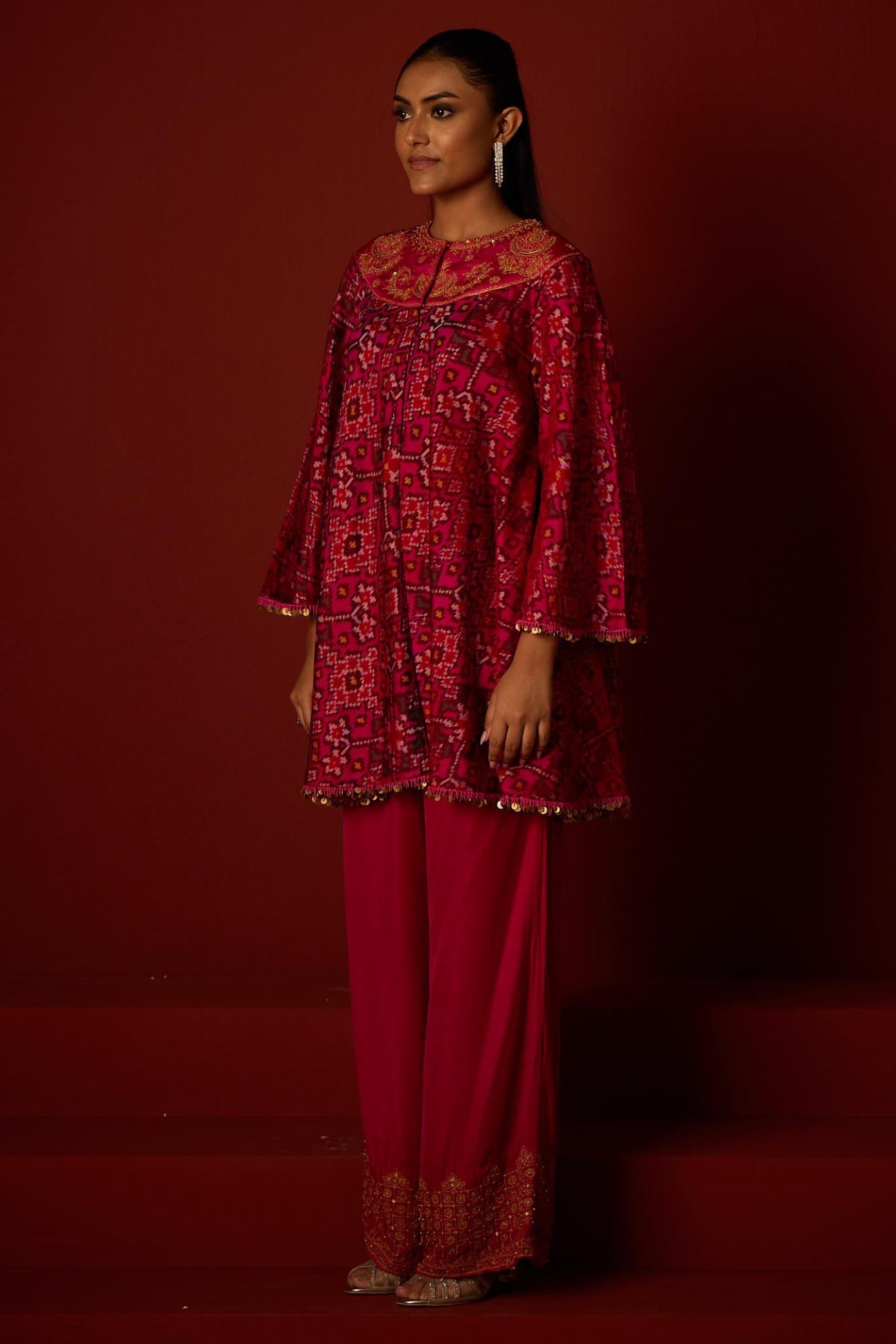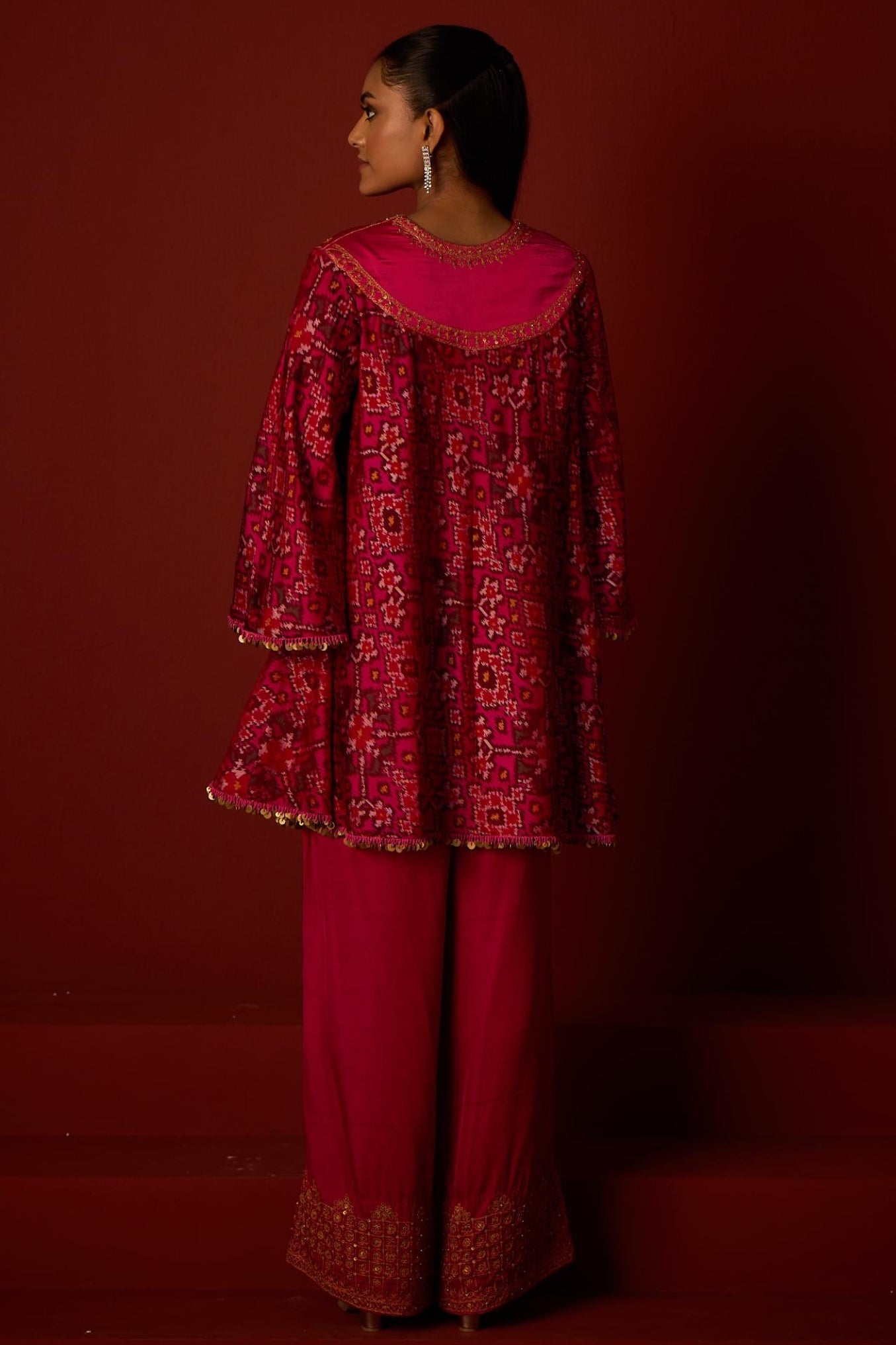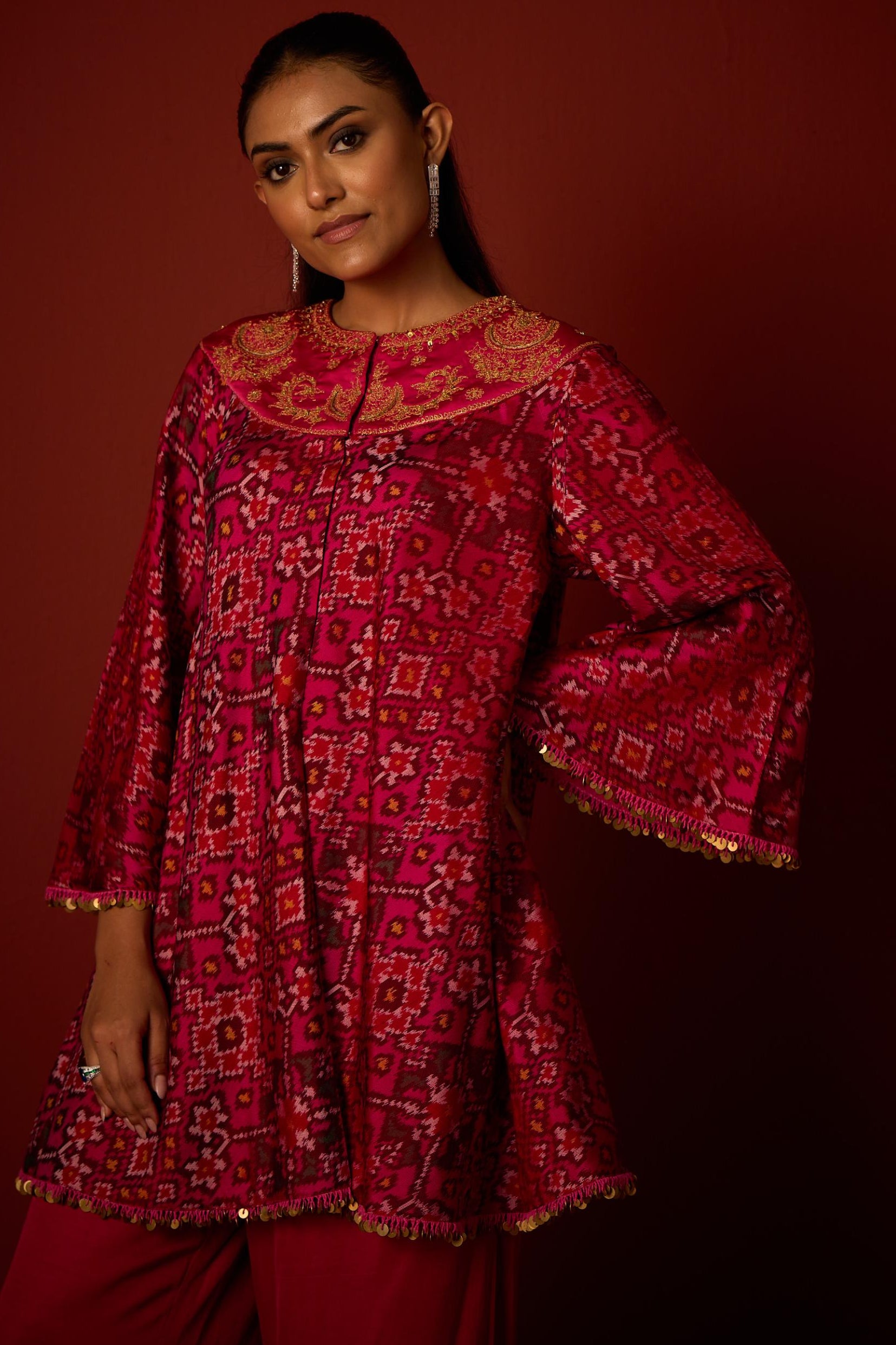 This Rani Pink tunic set blends patola artistry with a refined silhouette, perfect for elegant mehendi gatherings or festive lunches.