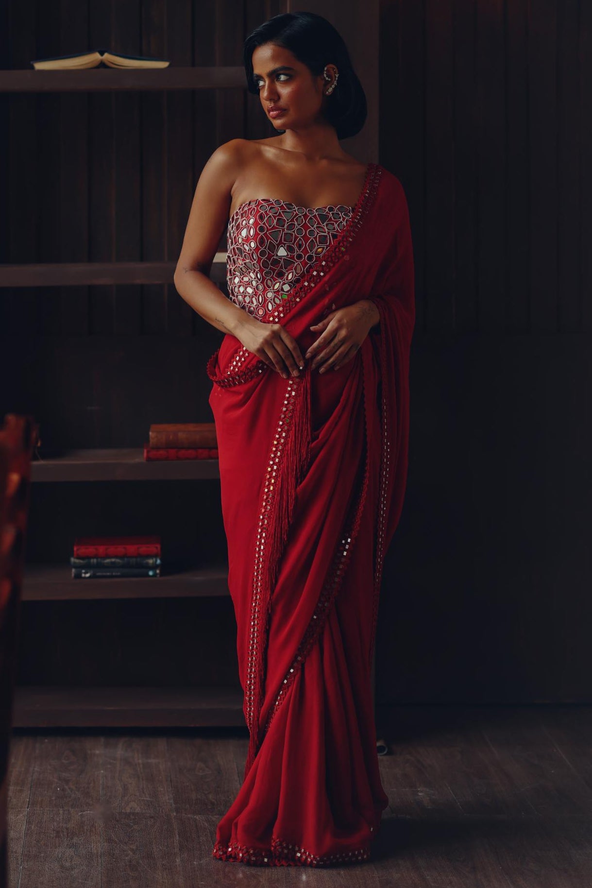This scarlet red georgette saree offers bold festive elegance with a soft scalloped border—perfect for receptions, sangeets, or cocktail nights.